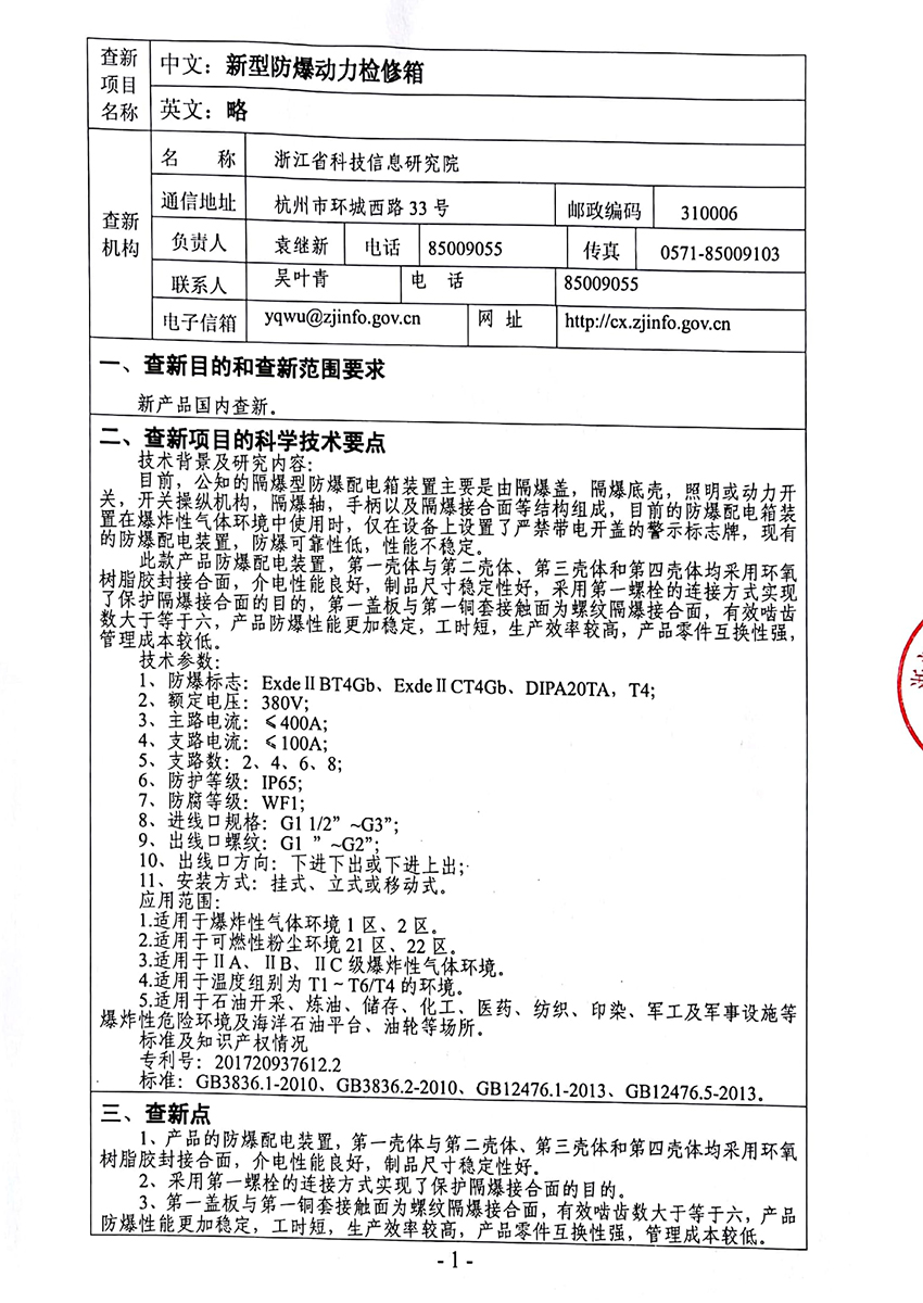 防爆動力檢修箱科技查新報告