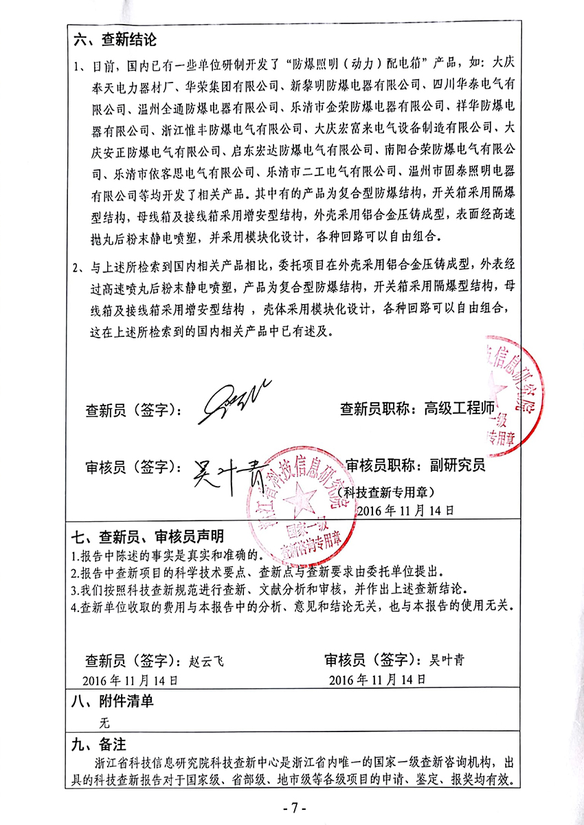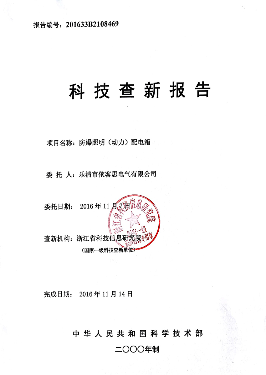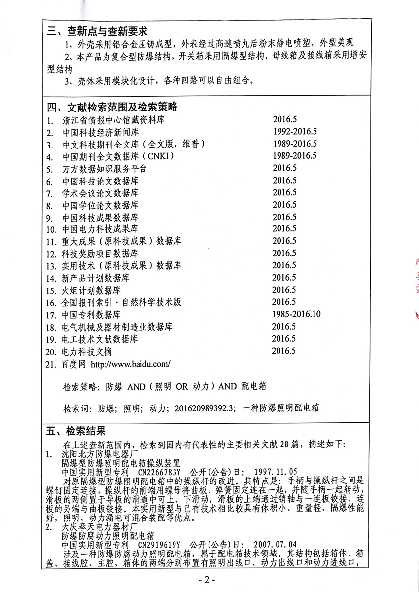 防爆照明動力配電箱科技查新報告